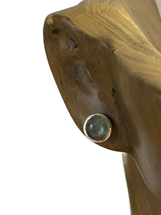 These stud earrings feature a cabochon of rainbow moonstone or labradorite set in sterling silver.