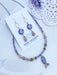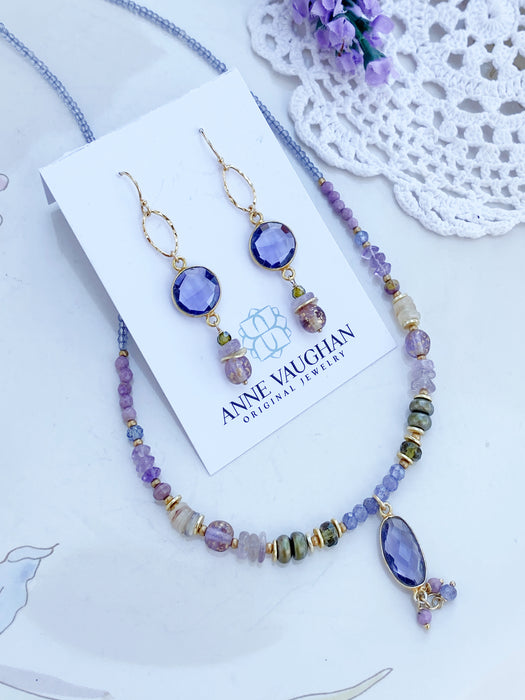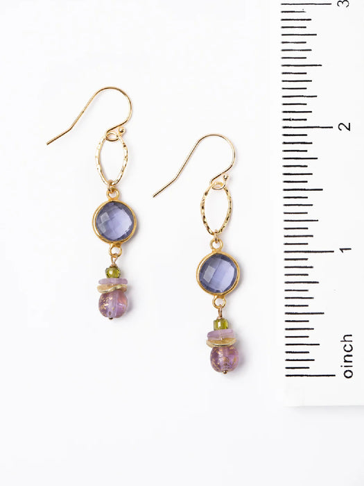 These colorful yet elegant statement earrings from the Hydrangea collection feature a hammered gold ringlet leading to a faceted tanzanite quartz focal piece, with a delightful stack of amethyst and Czech glass beads at the bottom.