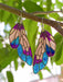 These dangle earrings are a beautiful blend of color and elegance, featuring turquoise, pink, and purple "stained glass" translucent acrylic enamel butterfly wings. With their delicate and colorful design, they add a vibrant touch to any outfit. Ideal for those who love bold, artistic accessories.