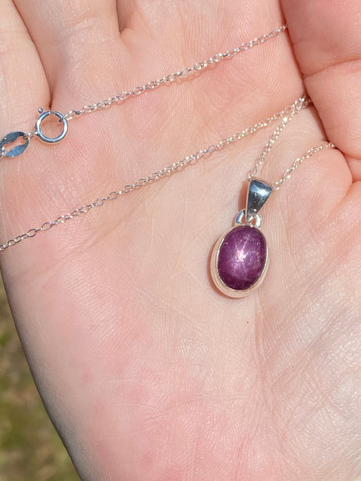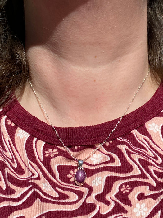 This special necklace is a unusual star ruby, a rare form of ruby displaying a phenomenon called asterism, natural mineral rutile inclusions that form the shape of a star. A pinky-purple star ruby cabochon is set in an oval pendant.
