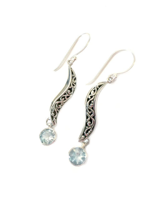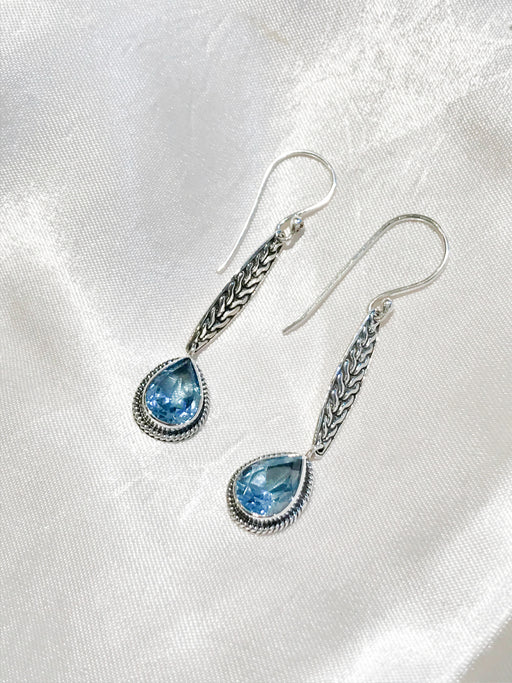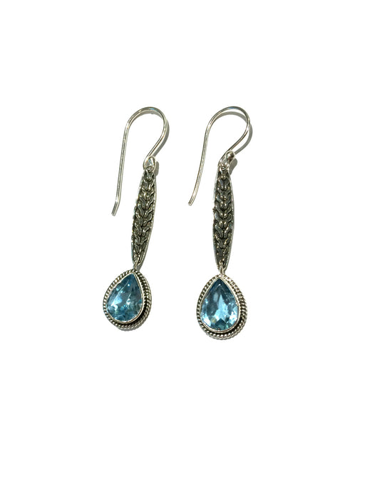 Original price $ 42.00 - Original price $ 42.00Original price$ 42.00$ 42.00 - $ 42.00Current price $ 42.00| /These chic dangle earrings feature a bar of silver leading to two faceted blue topaz gemstones with a silver swoop in between the stones. Sterling...