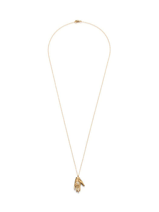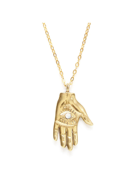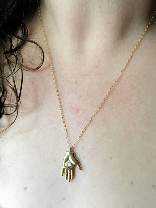 We all need the protection of a mystical talisman. Wearing the hand and eye amulet is said to protect from the evil eye and all manner of ills. This sturdy pendant is cast in detail with an eye in the palm set with a Czech opal crystal.