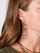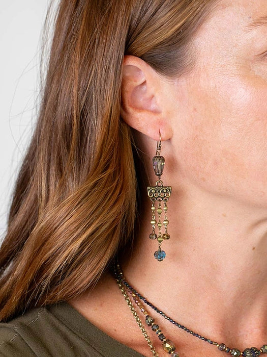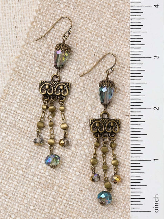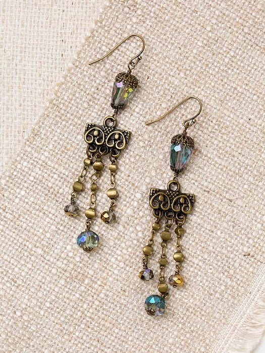 These earthy yet dramatic dangle earrings feature a antiqued brass chandelier style setting with iridescent green crystal beads, that create an understated statement earring.