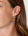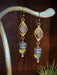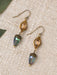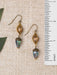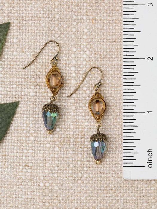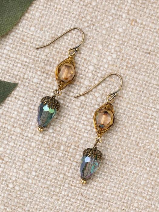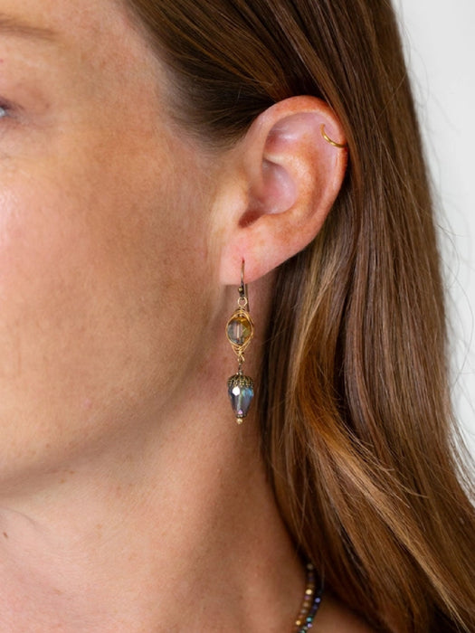 These vintage-inspired dangle earrings feature earthy shades of crystal beads with  antiqued brass details. Anne Vaughan's signature gold herringbone wire wrap holds the top smokey colored crystal, leading to an iridescent green crystal point focal bead.