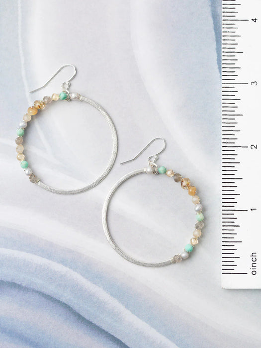 These earrings in the Mystic collection gives a soft ethereal glow with a combination of labradorite, turquoise, pearls, crystals & Czech glass beaded along a textured silver ring. Pair with the matching necklace for a mystical set -->