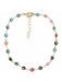 The "evil eye" charm is used across cultures as a talisman to protect the wearer against harm. This petite anklet is a row of linked eye charms in various colors including traditional blue, black, green, red, orange, yellow and pink.