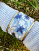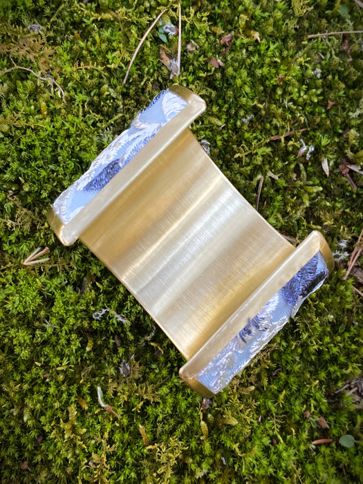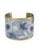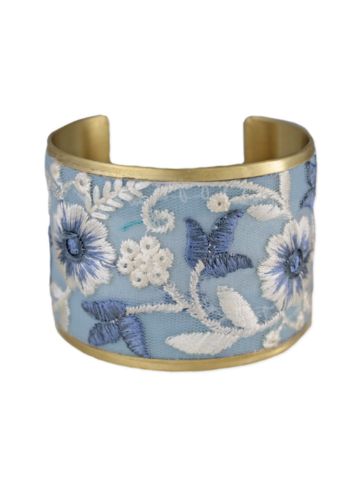 This magnificent statement cuff bracelet is a strip of blue floral embroidered fabric laid into a matte gold fashion cuff. Adjustable to fit most wrists by gently opening & closing around wrist.