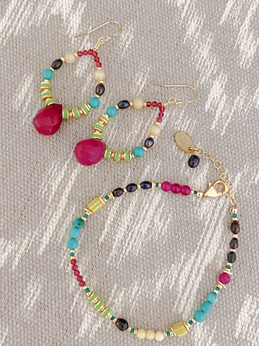 Experience the breathtaking beauty of Cabo with our new and vibrant collection. These handcrafted teardrop dangle earrings are the perfect compliment to the matching earrings. Stones used include turquoise, freshwater pearl, jade & ruby.