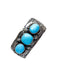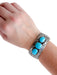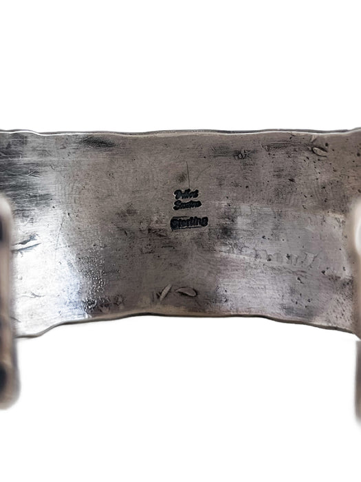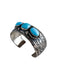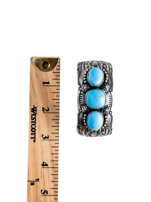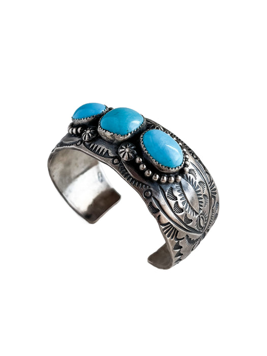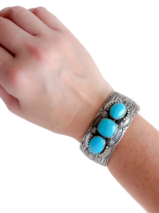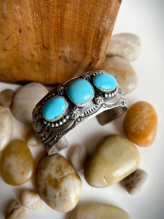 This high-end statement cuff bracelet is handmade in the American Southwest by Navajo artist Delbert Sacatero. This piece is hallmarked by the artist and features three large nuggets of bright blue Sleeping Beauty turquoise, nestled in a heavy silver setting surrounded with incredible detailed silver work using the traditional motifs that are a hallmark of Navajo jewelry design. This piece is a remarkable representation of the cultural history of jewelry-making by indigenous cultures, which we are honored to share with our customers.