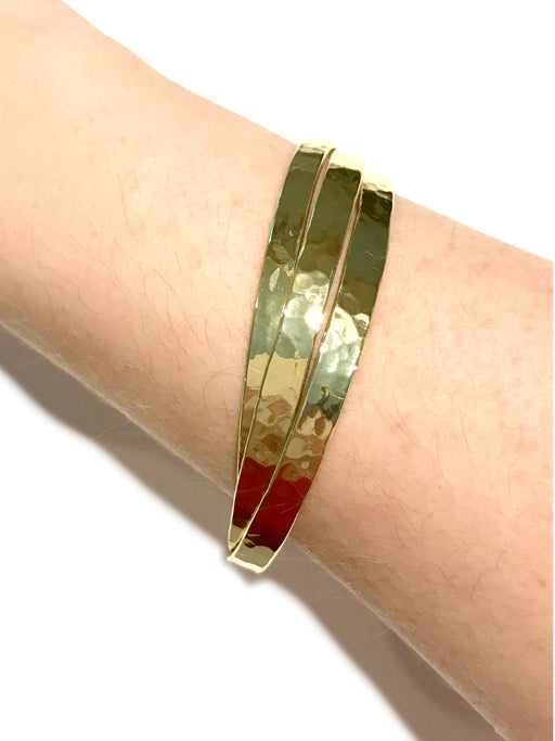 Original price $ 12.95 - Original price $ 12.95Original price$ 12.95$ 12.95 - $ 12.95Current price $ 12.95| /This classic cuff bracelet is three rows of hammered gold. They are welded together at the ends. Adjust to fit by gently squeezing around wrist. Go...