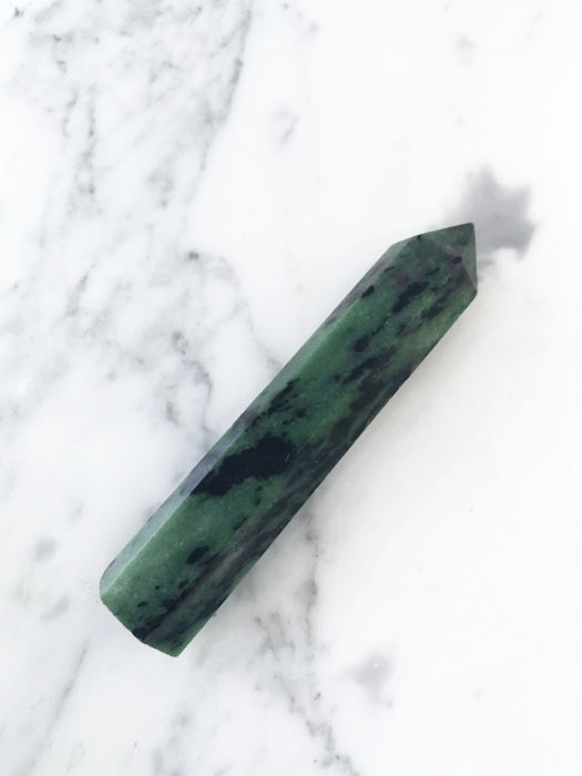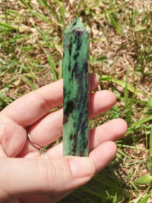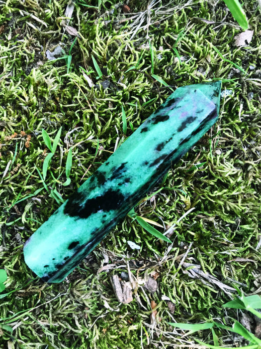 Ruby zoisite is a special vivid green stone (zoisite) with pink ruby deposits. This stone represents letting go of negative feelings and grief, and a boost of positivity. Use this stone in meditation, healing or decoration.