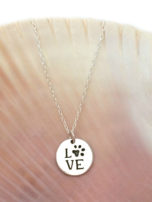 Original price $ 26.00 - Original price $ 26.00Original price$ 26.00$ 26.00 - $ 26.00Current price $ 26.00| /A sterling silver medallion pendant is embossed with "Love" with a paw print for the letter O. Comes on an 18" sterling silver chain. Pendant is 1/...
