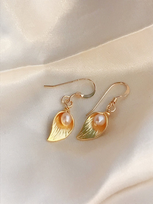 These elegant earrings feature a soft matte gold dangle of a lily flower holding a freshwater pearl bead.