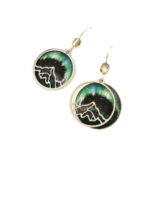 Original price $ 24.00 - Original price $ 24.00Original price$ 24.00$ 24.00 - $ 24.00Current price $ 24.00| /These celestial earrings feature a cutout silver mountain view resting on top of an beautifully decorated aurora borealis night sky. A pale green c...