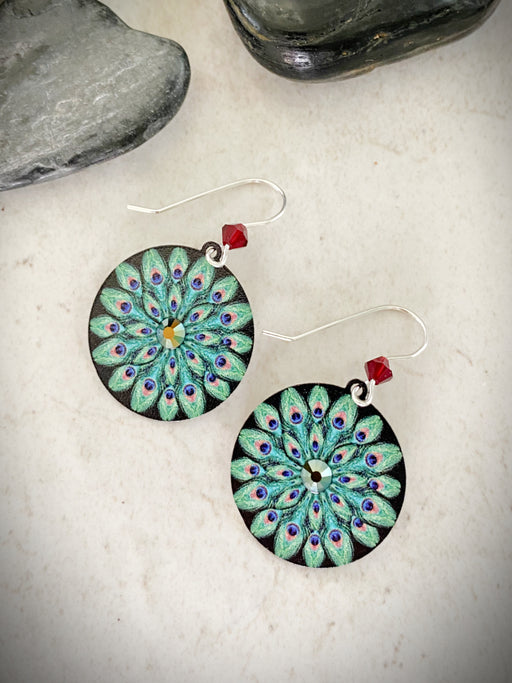 Original price $ 24.00 - Original price $ 24.00Original price$ 24.00$ 24.00 - $ 24.00Current price $ 24.00| /These dangle earrings feature a large disc enameled in a mandala design of peacock feathers radiating from a green center crystal. A purple crystal...