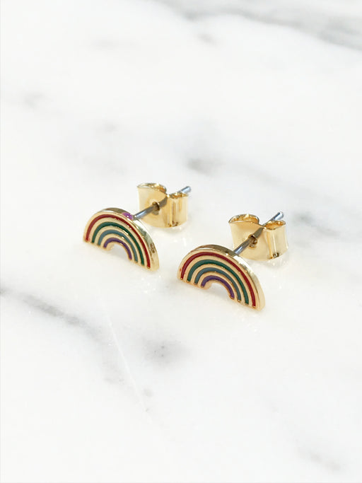 Original price $ 12.00 - Original price $ 12.00Original price$ 12.00$ 12.00 - $ 12.00Current price $ 12.00| /These colorful stud earrings are rainbows filled with vibrant enamel. Gold plated. 1/4" long and 3/8" wide.