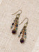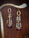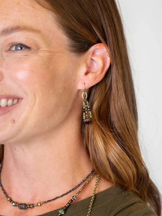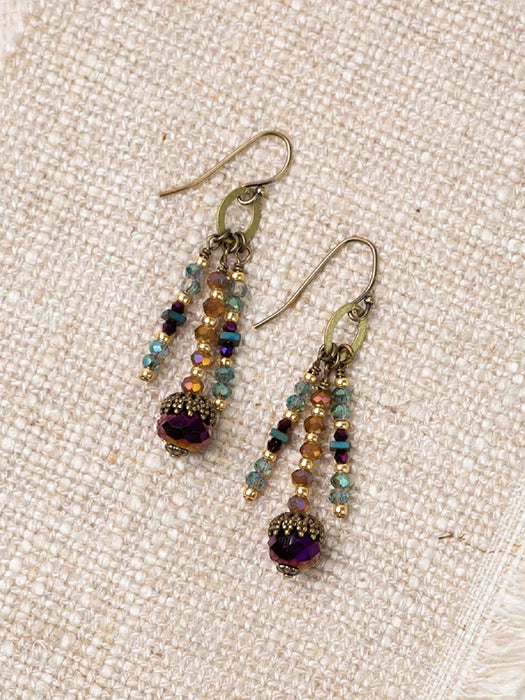 These fun earrings from the Crisp Autumn collection feature a brass ringlet with three beaded stacks of blue, gold and purple crystal and Czech glass beads for a fringed statement earring.