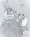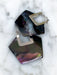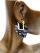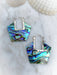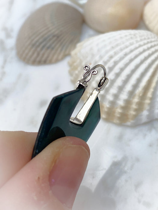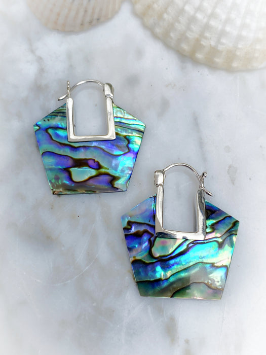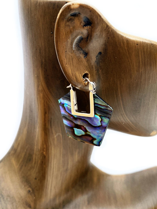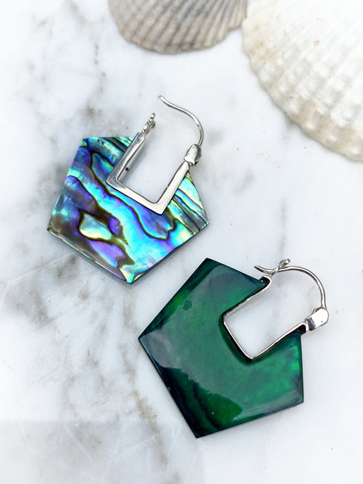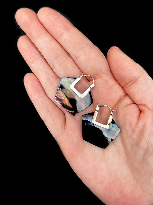 These hoop earrings are shell that has been shaped into pentagons and set with a silver pincatch clasp. The backside has been stabilized with an acrylic finish.