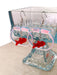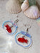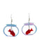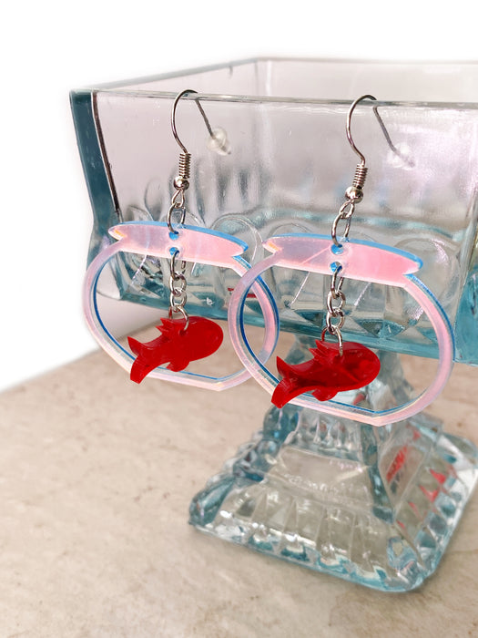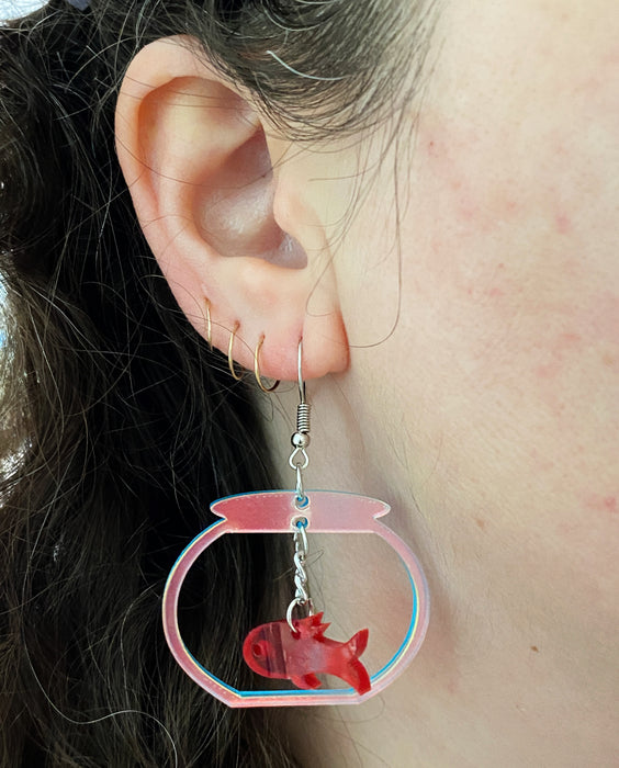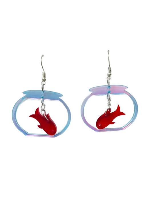 These playful earrings are holographic fishbowls with a dangle inside of a red-orange goldfish freely swimming. The lightweight holographic acrylic changes color in shades of blue pink and gold.