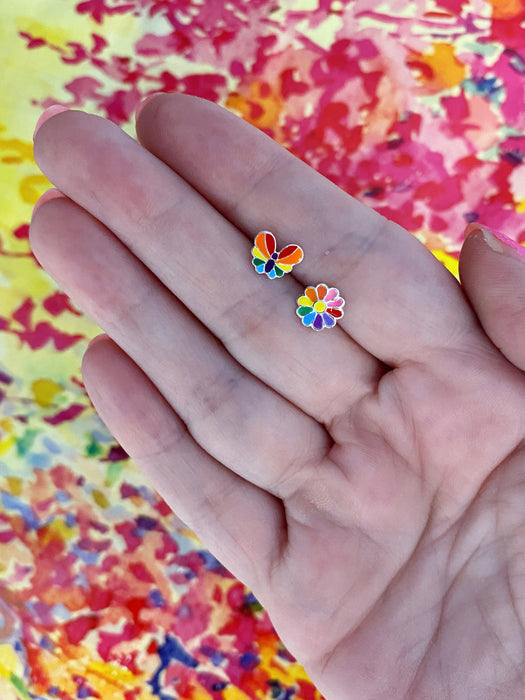 It's ~all butterflies and rainbows~ when you wear this darling pair of sterling studs! How can you have a bad day in these cuties? These adorably mismatched stud earrings are filled with a rainbow of colorful enamel.