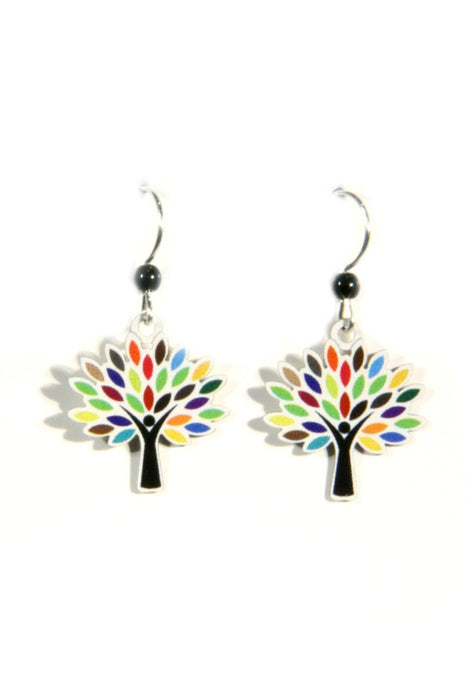 These happy enamel earrings are a tree full of rainbow colored leaves.