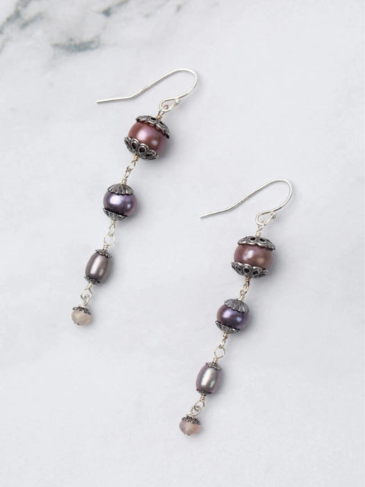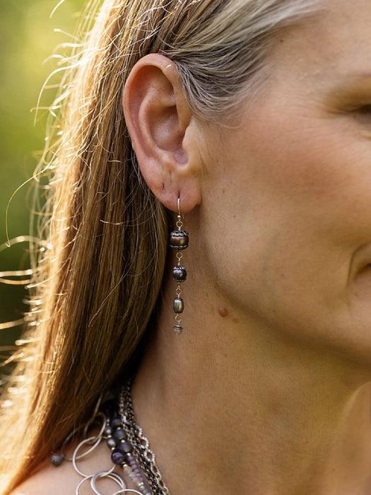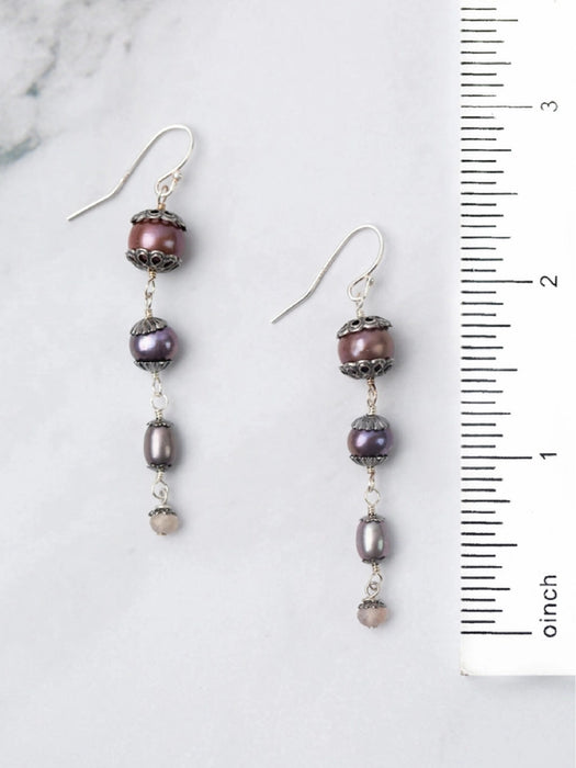 These statement earrings feature a cascade of purple peacock pearls, with a glass bead at the bottom, with antiqued silver filigree details.