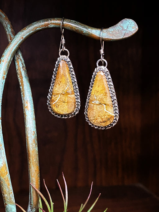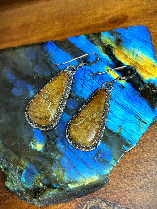Original price $ 66.00 - Original price $ 66.00Original price$ 66.00$ 66.00 - $ 66.00Current price $ 66.00| /These picture jasper teardrop dangle earrings were handmade by Navajo silversmith Alvin Joe. Large teardrops of earthy picture jasper are set in ha...
