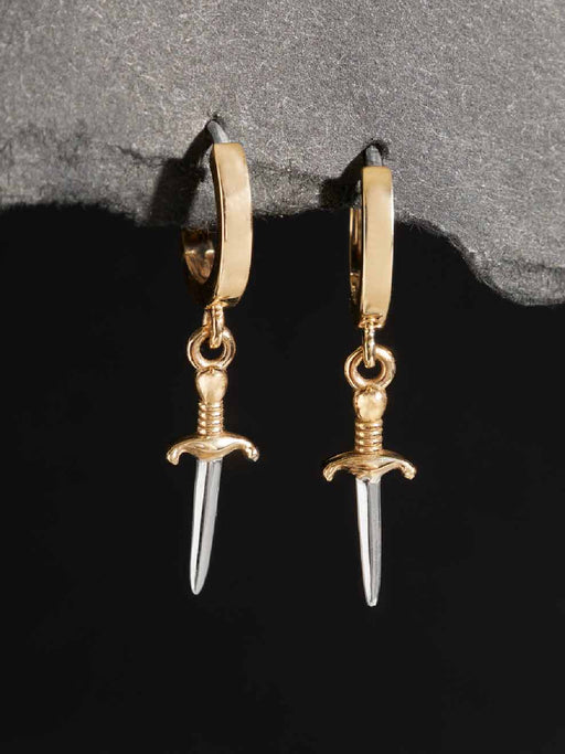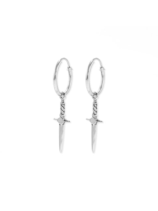 These hoop earrings have a charm of a small sword with a twisted handle.  Made with 100% recycled sterling silver. Hoop is 1/2", total length is 1....