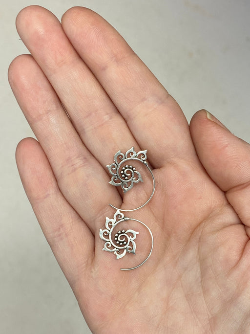These earrings are a swirl of silver with pointed silver petal detail. Simply spiral in and go! Sterling silver. 7/8" diameter.