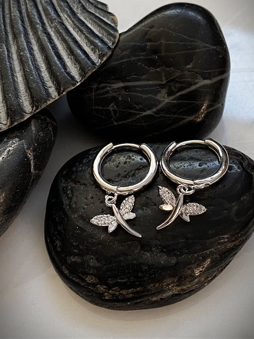 These huggie style hoops have a petite dragonfly charm, with clear CZ crystals in the wings. Choose from gold or white gold plated. 3/4" (2cm) long.