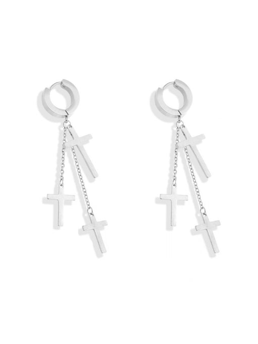 These statement hoop earrings are thick huggie hoops with a cascading dangle of three crosses attached to stele chain. Huggie hoops are hinged at t...