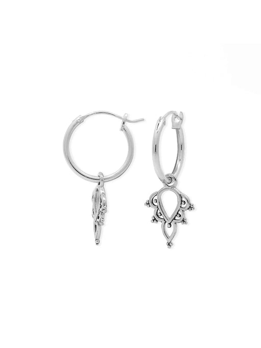 These sleek pincatch hoops have a drop of an ornate filigree design. Sterling silver. 1" long. Hoop has a 1/2" diameter. Made by boma.