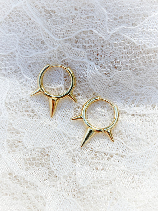 These edgy huggie hoops have three spikes along the edge. Huggie hoops are hinged at the bottom of the hoop and snap to clasp. Available in gold an...