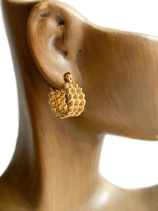 These chunky stud hoop earrings have one solid bar and one twisted loop that curl under the earlobe for a double-hoop style. Post closure. Gold pla...