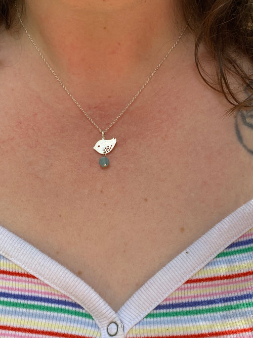 Original price $ 32.00 - Original price $ 32.00Original price$ 32.00$ 32.00 - $ 32.00Current price $ 32.00| /This necklace features an adorable little spotted bird pendant with an ocean blue Swarovski crystal dangle. Sterling silver pendant and chain. Hand...