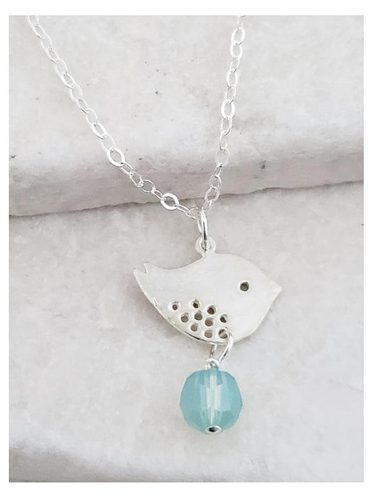 This necklace features an adorable little spotted bird pendant with an ocean blue Swarovski crystal dangle.