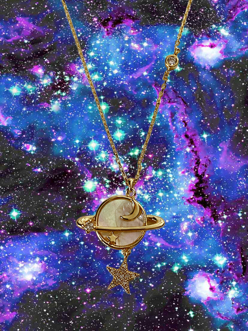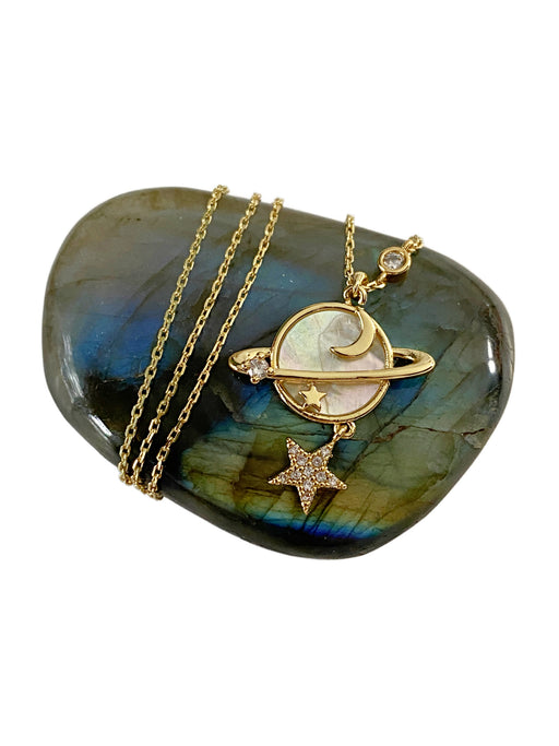 Original price $ 22.00 - Original price $ 22.00Original price$ 22.00$ 22.00 - $ 22.00Current price $ 22.00| /This necklace features the outline of the planet Saturn filled with a disc of iridescent white mother of pearl shell. A gold crescent moon and sta...
