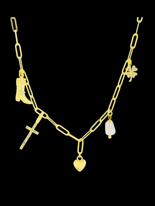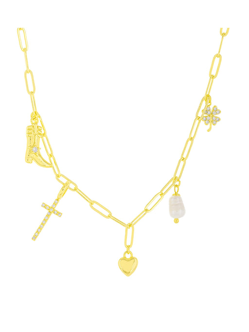 Original price $ 20.00 - Original price $ 20.00Original price$ 20.00$ 20.00 - $ 20.00Current price $ 20.00| /This super trendy necklace is chunky gold link paper clip chain with five dangling charms accented with CZ crystals- a cowgirl boot, puff cross, he...