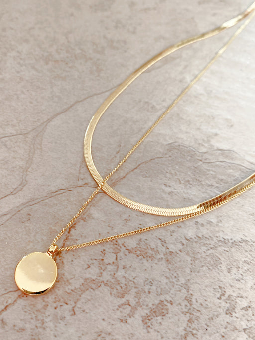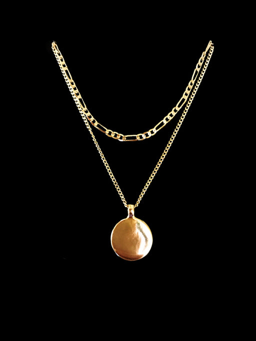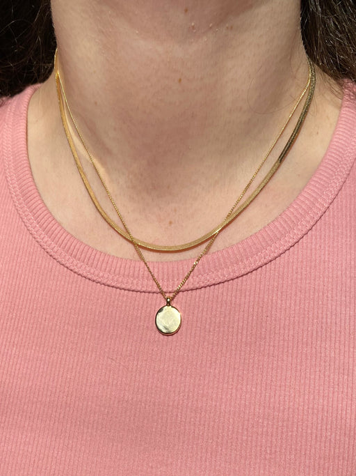 Original price $ 18.00 - Original price $ 18.00Original price$ 18.00$ 18.00 - $ 18.00Current price $ 18.00| /Classic chain necklace has two layers: top is shiny woven herringbone chain, bottom chain holds a shiny round medallion pendant on a light linked c...