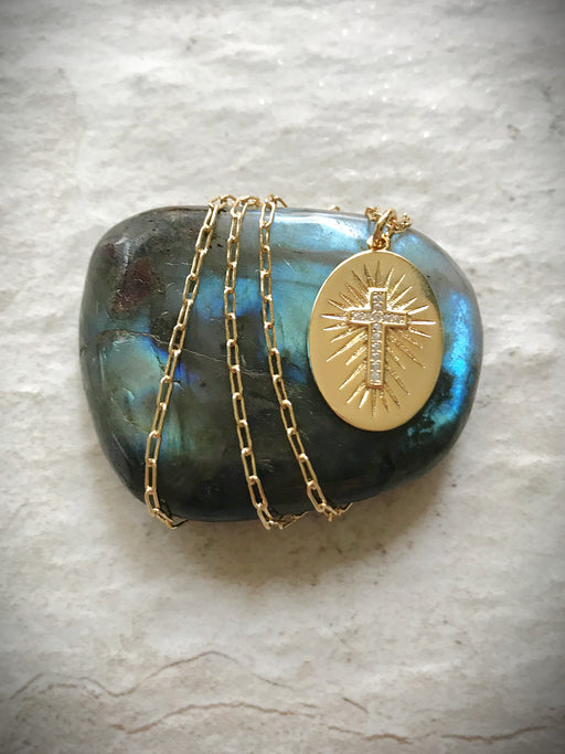 Original price $ 18.00 - Original price $ 18.00Original price$ 18.00$ 18.00 - $ 18.00Current price $ 18.00| /This on trend choker necklace features an oval medallion pendant with a CZ lined cross in the center surrounded by etched rays, on an open and airy...