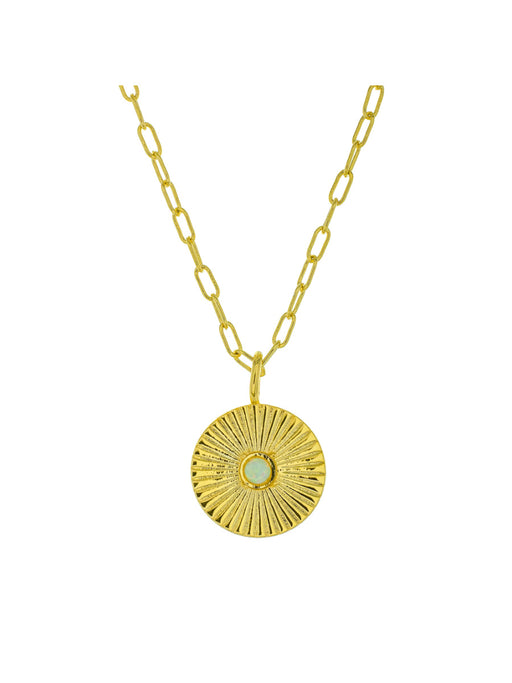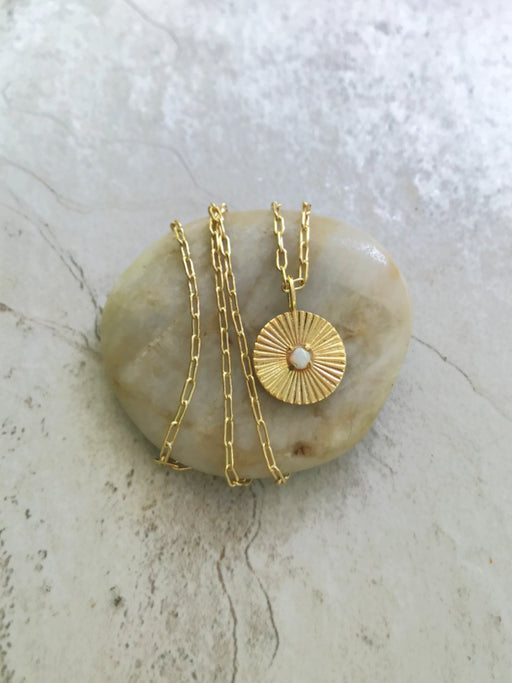 Original price $ 16.00 - Original price $ 16.00Original price$ 16.00$ 16.00 - $ 16.00Current price $ 16.00| /A golden disc embossed with bursting rays is set in the center with a sparkling faux white opal. Gold plated pendant and linked chain. Adjustable l...