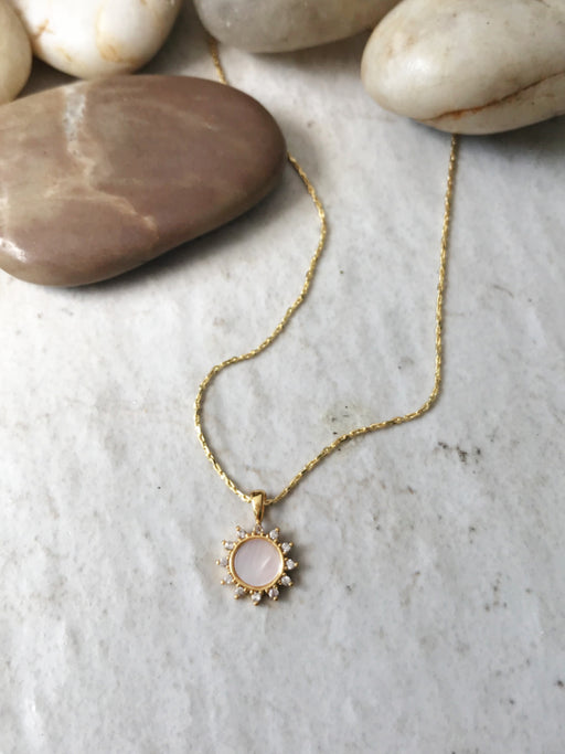 Original price $ 16.00 - Original price $ 16.00Original price$ 16.00$ 16.00 - $ 16.00Current price $ 16.00| /This summery necklace has a pendant of a radiant sun set with creamy mother of pearl shell in the center and clear CZ crystals studding the sun ray...