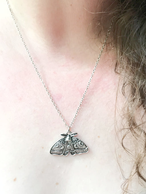 Original price $ 12.95 - Original price $ 12.95Original price$ 12.95$ 12.95 - $ 12.95Current price $ 12.95| /This antiqued silver fashion chain holds a pendant of a Luna Moth embossed with the moon phases across the wings with oxidized details. Pendant is...