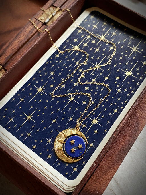 Original price $ 18.00 - Original price $ 18.00Original price$ 18.00$ 18.00 - $ 18.00Current price $ 18.00| /This celestial necklace has a medallion pendant of a creamy white shell crescent moon and a sky of blue-green abalone shell. A star is set with a c...