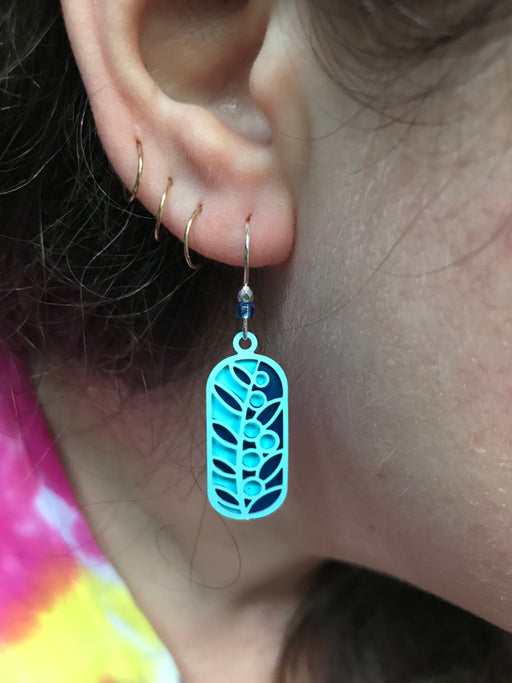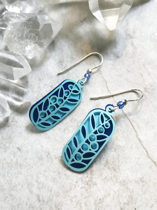 Original price $ 24.00 - Original price $ 24.00Original price$ 24.00$ 24.00 - $ 24.00Current price $ 24.00| /These dangle earrings feature an elongated steel oval enameled with a two tone blue background and overlaid with a cut out piece enameled in light ...