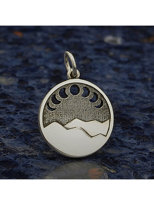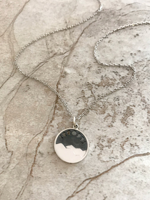 This celestial pendant necklace features a range of shiny silver mountains set against an oxidized sky with the phases of the moon cutout.