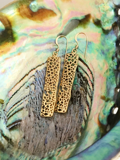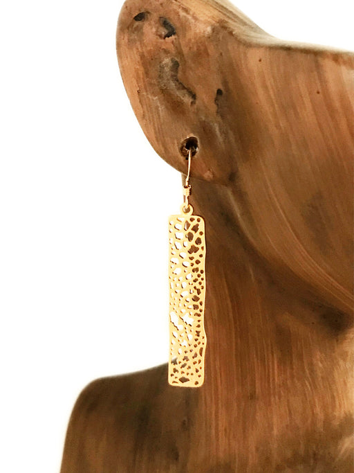 Original price $ 25.00 - Original price $ 25.00Original price$ 25.00$ 25.00 - $ 25.00Current price $ 25.00| /These textured dangle earrings are a long bar cutout with a leaf-inspired pattern. The bar is dipped in 16kt gold and given a soft matte finish. Th...