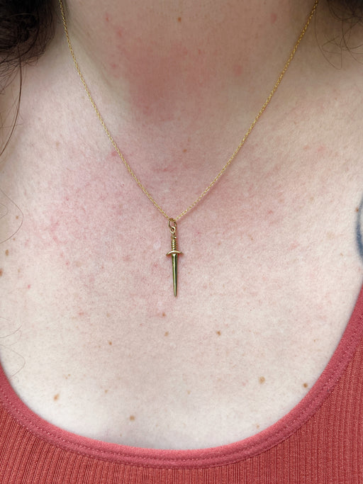 Original price $ 24.00 - Original price $ 32.00Original price$ 24.00 - $ 32.00$ 24.00 - $ 32.00Current price $ 24.00| /This necklace features a beautifully detailed miniature replica of a medieval sword, crafted in bronze. Swords and daggers can connote power, prote...
