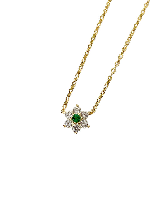 Original price $ 28.00 - Original price $ 28.00Original price$ 28.00$ 28.00 - $ 28.00Current price $ 28.00| /This necklace features a centerpiece of a cluster of clear CZ crystals grouped into a sweet flower with an emerald green crystal in the center. Cab...