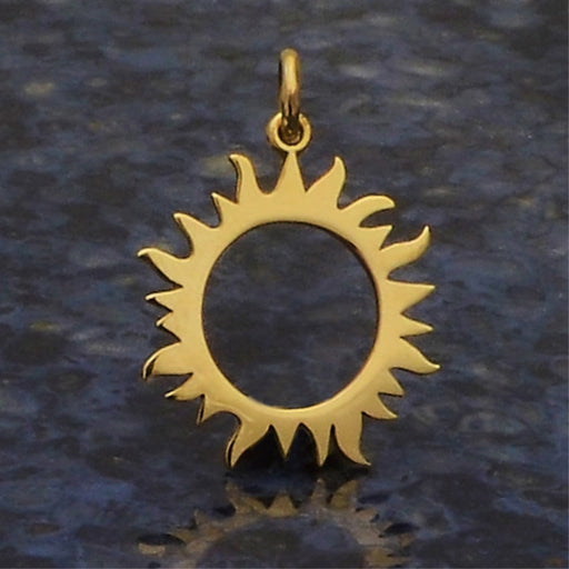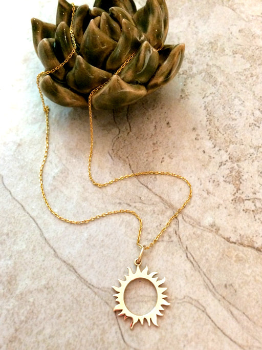 Original price $ 24.00 - Original price $ 24.00Original price$ 24.00$ 24.00 - $ 24.00Current price $ 24.00| /Harness the sun's golden rays with this necklace of a blazing sun outline. Bronze pendant and 14kt gold vermeil cable chain. Pendant hangs about 1"...